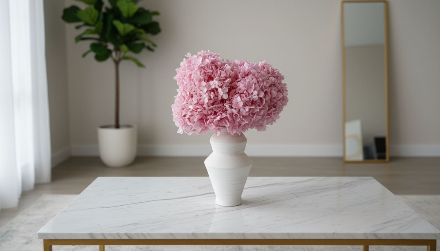 The foyer sets the tone for the entire residential experience. It is the bridge between the chaotic outside world and the serenity of the home. For this space, we recommend a piece with height and architectural drama. The Aurelle – Cadillac Pink Preserved Hydrangea Arrangement is a perfect candidate. Its "sculptural white jagged vase" offers a modern, edgy contrast to the lush volume of the Cadillac Pink hydrangeas. Placed on an entryway console, it serves as a vibrant, sculptural welcome that never wilts, providing a warm greeting to every guest who enters.
